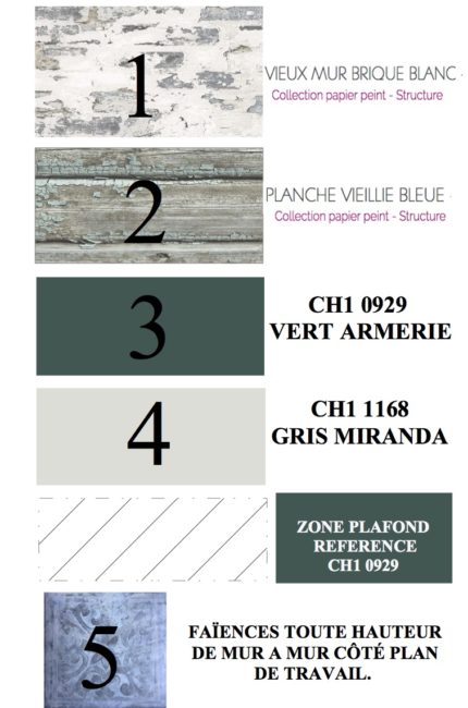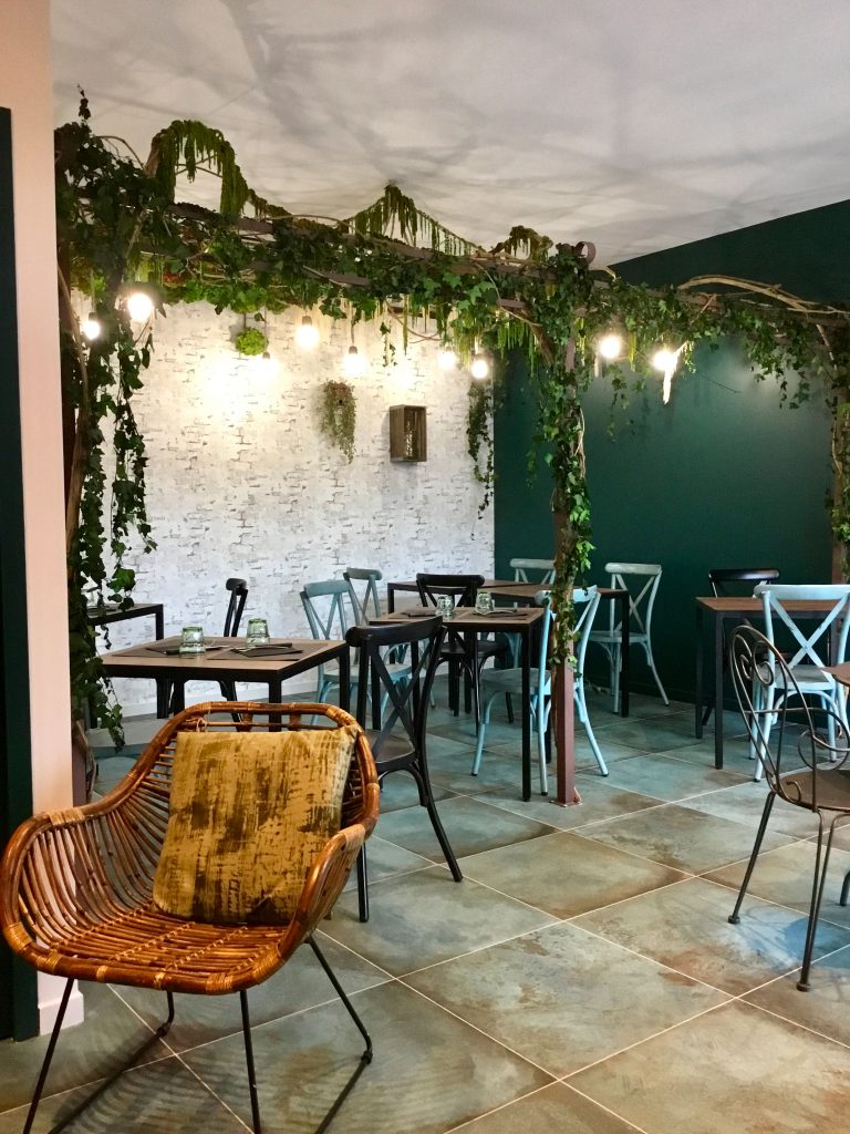 Pour ce projet, la planche d’ambiance était nécessaire au choix des différents matériaux. Elle a été le premier visuel présenté au client pour donner la direction au projet. Cette planche proposait un mélange de pierres naturelles, de carreaux ciment, de bois… L’intention était donnée……. emmener les clients manger au coeur d’un jardin….. Une ancienne pergola a été installée pour le côté salle et des végétaux stabilisés Côté Jardin « Le Patio », ont été apportés pour créer un univers de « jardin en friche ».