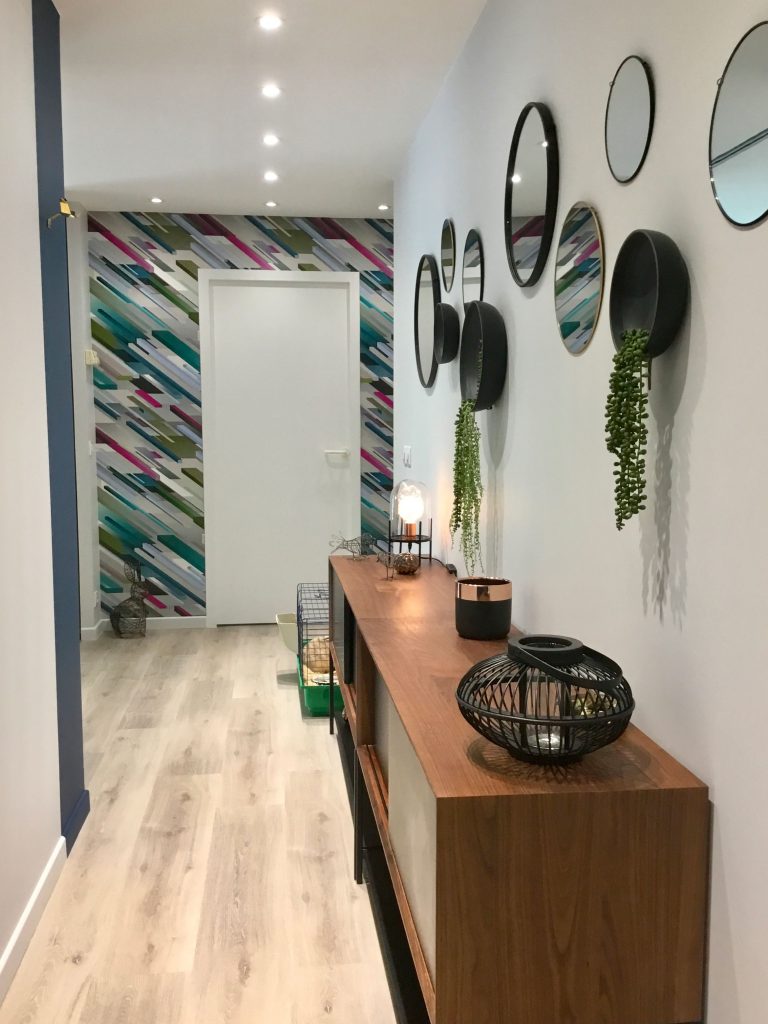 Année : 2018Une revisite totale des espaces à vivre pour cet appartement aux portes de Chambéry en Savoie. L’implantation des espaces a été modifiée pour répondre au cahier des charges de la cliente. Outre les contraintes techniques, le mot d’ordre était « ambiance colorée ». Du sol au plafond tout a été modifié pour apporter des solutions de rangements multiples et d’éclairages ciblés. L’ambiance se veut dynamique avec des touches de couleurs saturées. Un papier peint très coloré vient dynamiser l’entrée . La décoration/accessoires vient mettre en valeur ces couleurs vives. Patères oiseaux en laiton, plat en bambou revisités et détournés en décoration murale, végétaux pour adoucir et apporter la nature dans la maison.